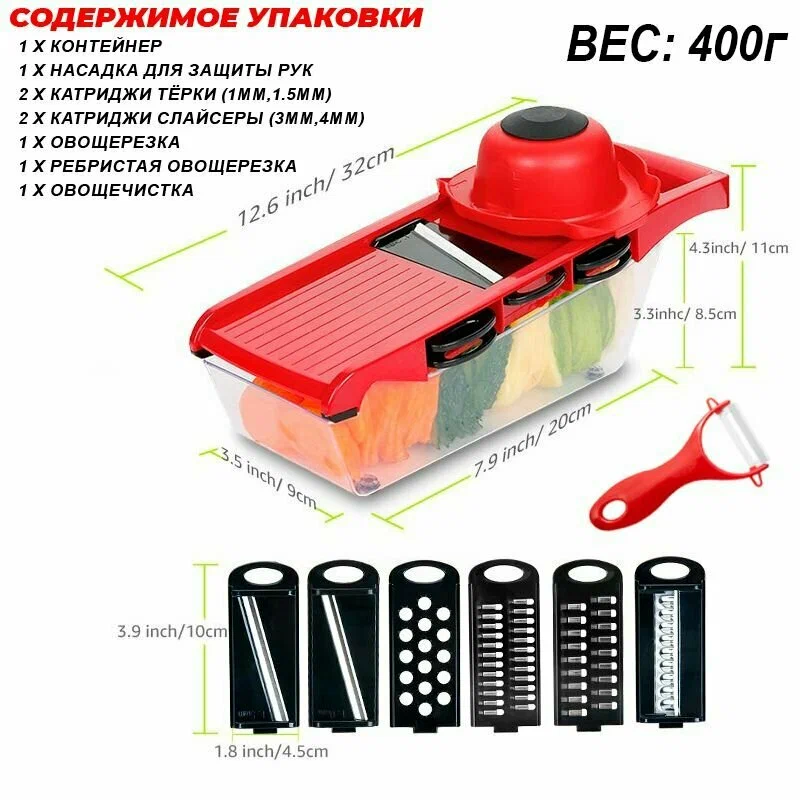 Устали тратить время на нарезку овощей и фруктов? Хотите, чтобы процесс приготовления стал быстрым и удобным? Наша фрукто-овощерезка 10в1 – идеальное решение для вашей кухни! Этот универсальный измельчитель сэкономит ваше время и силы, позволяя легко нарезать, шинковать и тереть любые ингредиенты. ✅ Многофункциональность: 10 вариантов нарезки в одном устройстве. Нарезайте овощи для салатов, корейские слайсы, ломтики для супов и рагу, натирайте чеснок и сыр – все это быстро и без лишних усилий. ✅ Прочные лезвия из нержавеющей стали: Острые и долговечные лезвия обеспечивают аккуратную нарезку без деформации продуктов. Больше никаких раздавленных помидоров или неровных ломтиков! ✅ Объемный контейнер для сбора: Готовые нарезанные продукты удобно собирать в контейнер из прочного пластика. Больше не нужно перекладывать ингредиенты – просто нарезали и сразу добавили в блюдо. ✅ Специальный держатель для безопасности: Удобная ручка и фиксатор обеспечивают комфортное использование без риска порезаться. Даже дети могут помочь на кухне под присмотром взрослых. ✅ Легкость хранения и ухода: Компактный дизайн экономит место на кухне, а разборная конструкция позволяет быстро помыть все детали под проточной водой. ✅ Эргономичный дизайн: Удобная форма и легкий вес делают работу с овощерезкой комфортной даже при длительном использовании. ✅ Подарочная овощечистка в комплекте: Дополнительный бонус для тех, кто любит полезные и практичные подарки. ✨ Идеально для приготовления салатов, закусок, супов и гарниров. Сэкономит ваше время и силы на кухне. Превратит процесс готовки в удовольствие! Отзывы наших покупателей: Анна, Москва: "Пользуюсь этой овощерезкой уже месяц – просто восторг! Теперь готовлю салаты в два раза быстрее. Особенно нравится насадка для корейской моркови – получается идеально ровно. Очень удобно и практично!" Дмитрий, Санкт-Петербург: "Подарил жене на день рождения – она в восторге! Говорит, что теперь нарезка овощей занимает считанные минуты. Контейнер очень удобный, не нужно лишний раз пересыпать продукты." Елена, Казань: "Искала компактную и функциональную овощерезку – эта модель превзошла все ожидания. Лезвия острые, нарезка ровная, а мыть легко. Отличный помощник на кухне!"