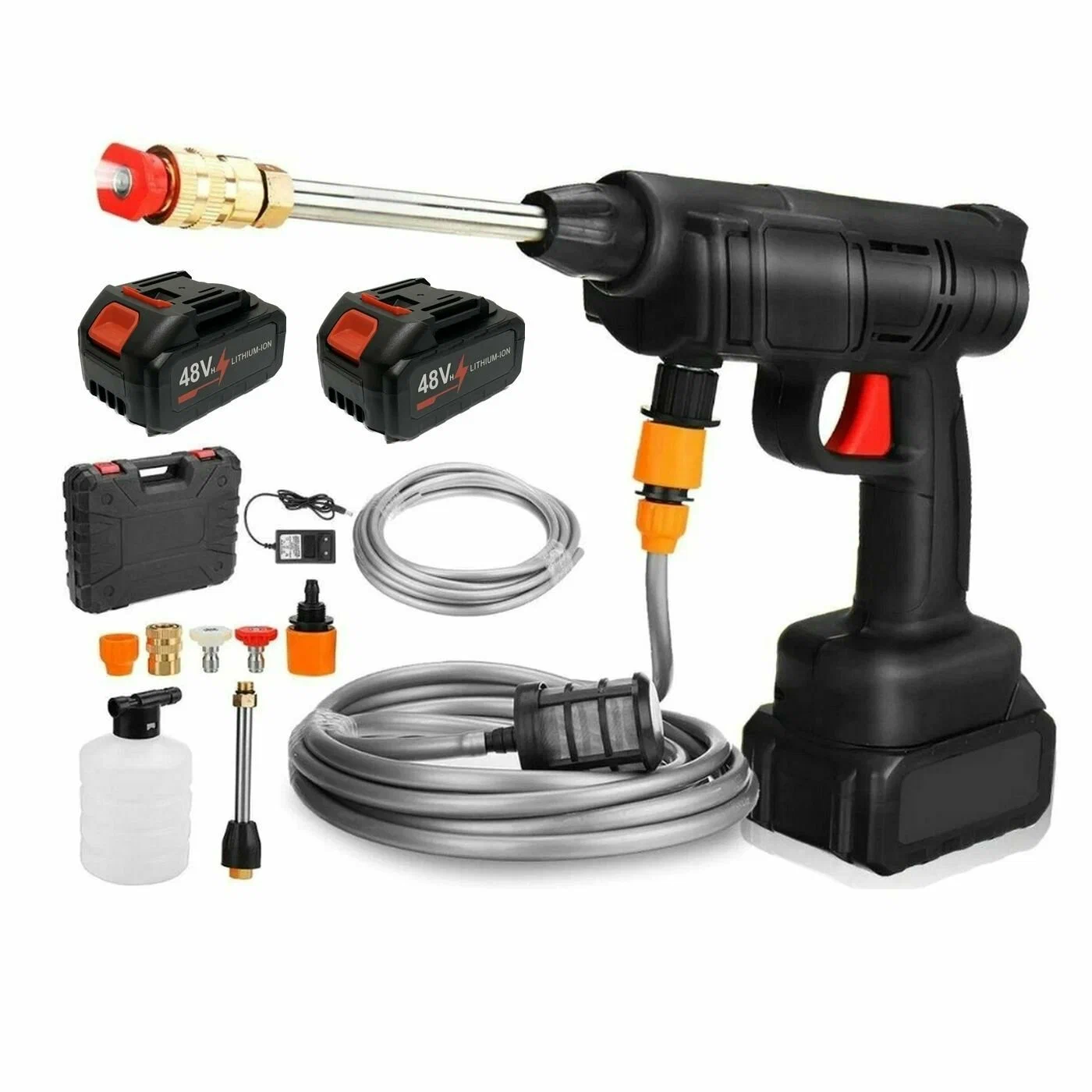 Мойка высокого давления аккумуляторная позволяет мыть машину без подключения к сети. Мощности автомойки хватает, чтобы очистить даже сложные загрязнения. В комплекте есть сменные насадки, поэтому можно чистить машину, ковры, окна, бытовые предметы и многое другое. Рассеивающая насадка обеспечивает распыление воды, которое подойдет для полива растений. Насадка-сплинкер – для мойки авто и твердых поверхностей. Пеногенератор быстро и равномерно наносит моющее средство. Мойка имеет форму, напоминающую водяной пистолет, поэтому ей удобно пользоваться. Длинный шланг позволяет набирать воду из любой ёмкости. Без подзарядки минимойка может работать около 30 минут.
