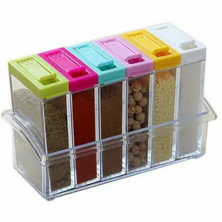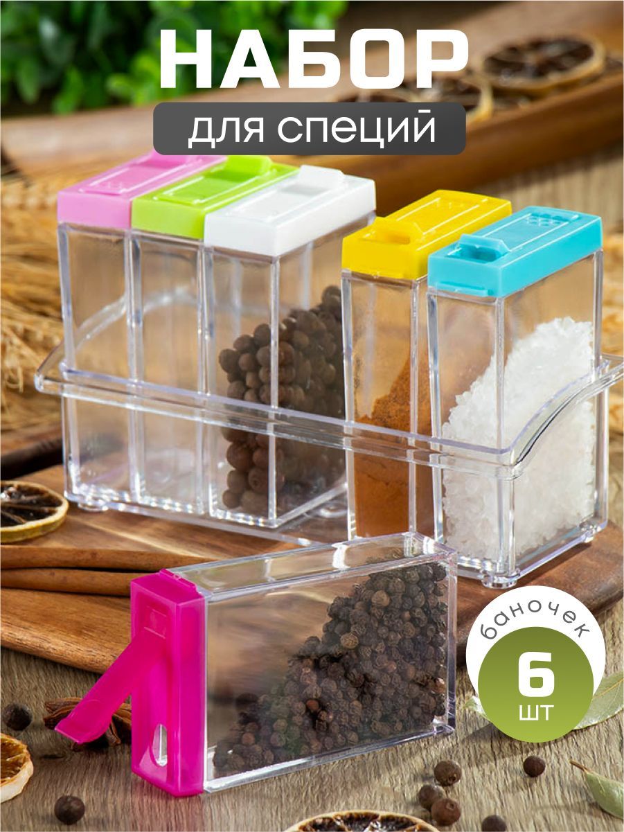 Набор из 6 баночек для специй на подставке оптом для украшения кухни. Полезное приспособление для тех, кто пользуется приправами. Набор включает 6 емкостей, каждая имеет крышку, выполненную из цветного пластика. Весь комплект изготовлен из полимера, допущенного до контакта с пищей. Позволяет хранить 6 различных приправ, дозируя их в процессе применения. Баночки располагаются на устойчивой подставке. Емкости и подставка сделаны из прозрачного материала.