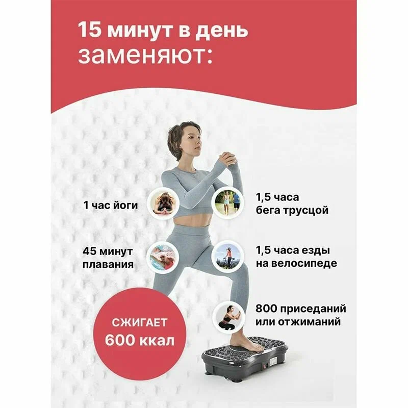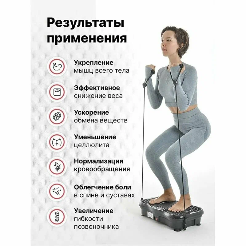 отите похудеть и подтянуть свое тело? Тренажер эффективно стимулирует мышечные ткани и подкожную жировую прослойку. Он представляет собой электрический массажер для ног который помогает вам избавиться от целлюлита и лишнего веса, а также восстановить эластичность мышц. Всего 10 минут упражнений на блютуз вибротренажере равноценны 2 часам занятий в тренажёрном зале. Наш антицеллюлитный массажер работает на базе вибрационных колебаний и подходит для занятий дома. Это идеальное решение для тех, кто хочет оздоровить свое тело и подтянуть кожу. Фитнес тренажёр ускоряет сжигание жира. Поможет избавиться от лишнего веса и целлюлита, подтянуть кожу, сделать ее более эластичной, активировать процесс кровообращения и снять отеки. Действие вибротренажера основано на вибрационных технологиях, благодаря которым происходит рефлекторное сокращение мышц до 50 раз в секунду и обеспечивает глубокую стимуляцию мышечных тканей и подкожной жировой прослойки. Вибромассажер оказывает положительное воздействие на костные ткани сухожилия и кровеносные сосуды и тренирует вестибюлярный аппарат активирует процесс кровообращения и снимает отеки. Акупунктурная поверхность положительно воздействует на нервную систему, ускоряет кровоток и обменные процессы. Массажер имеет 5 режимов вибрации и 10 программ тренировка для брюшной полости расслабляющий режим тренировка с плавающими движениями беговой режим бег трусцой быстрая ходьба ходьба средняя кардио-тренировка. Данная платформа также может служить как степ платформа. Эспандеры в комплекте помогут создать дополнительную нагрузку на мышцы рук. Будьте красивые и здоровы! Спорт – это здоровье, а занятия на виброплатформе степпере способствуют оздоровлению организма. Вибрации действуют на все тело разгоняя лимфу помогая привести себя в форму. При регулярном выполнении на платформе упражнений для спины и шеи позволяет укрепить спинной корсет и снять напряжение.